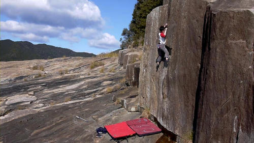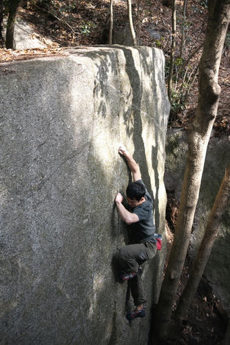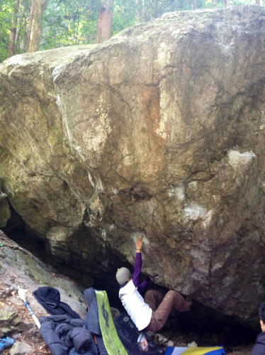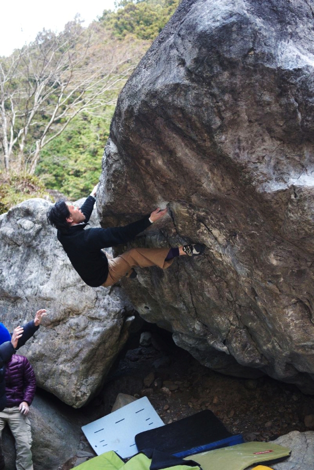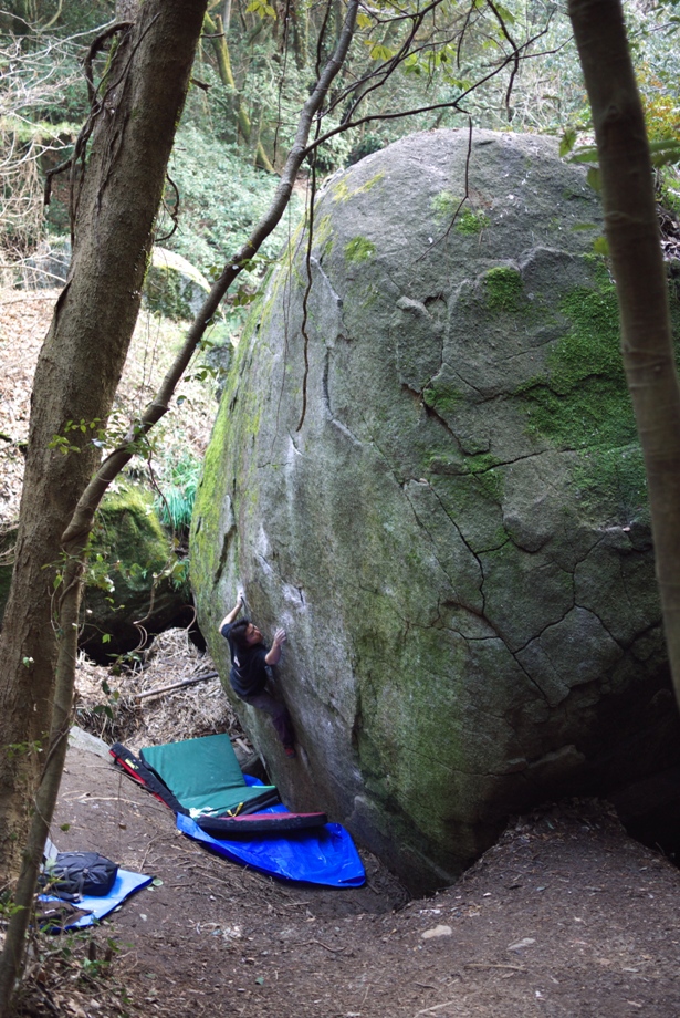 火消し岩という岩で遊んだ。まずは鬼火消し。スタート部分のムーブが良く分からず3トライ目でようやくGET。岩が冷たすぎて途中から感覚なくなった!少し休んでから鬼火消しを右上する纏で遊ぶことに。中間部のガバに気持ち地ジャンして纏の部分のムーブをやってみて、つなげ1トライ目で登ることができた。その後火消し岩の下にある岩のしばてんという課題に目が引かれたのでそっちで遊ぶ。