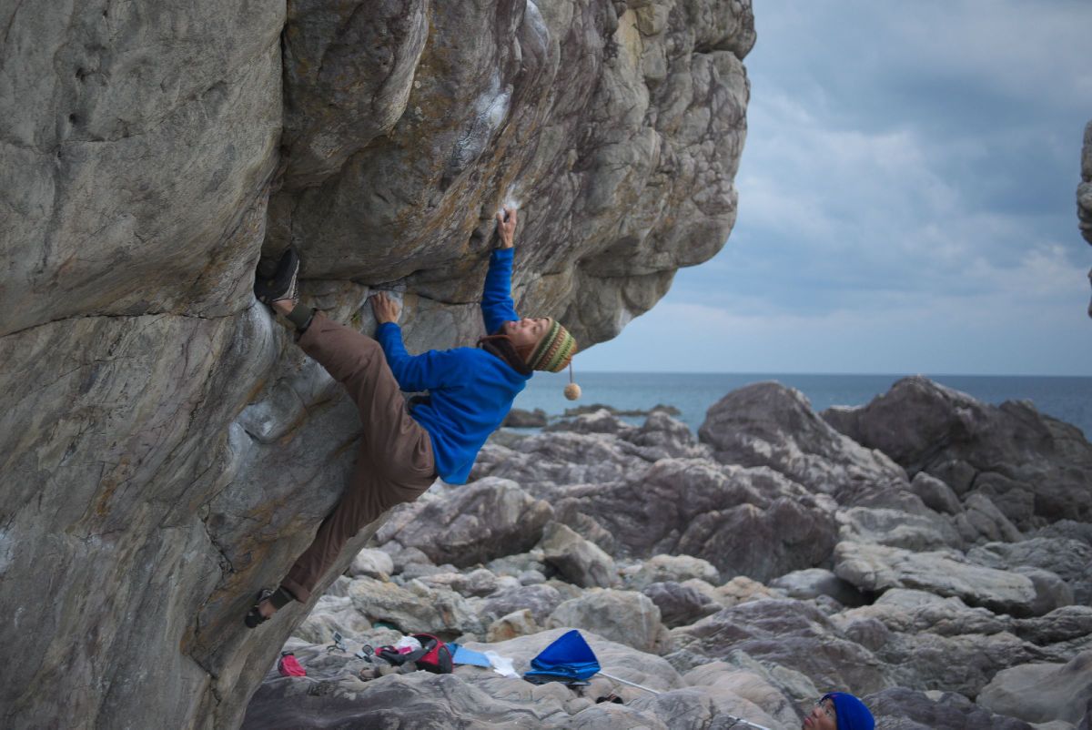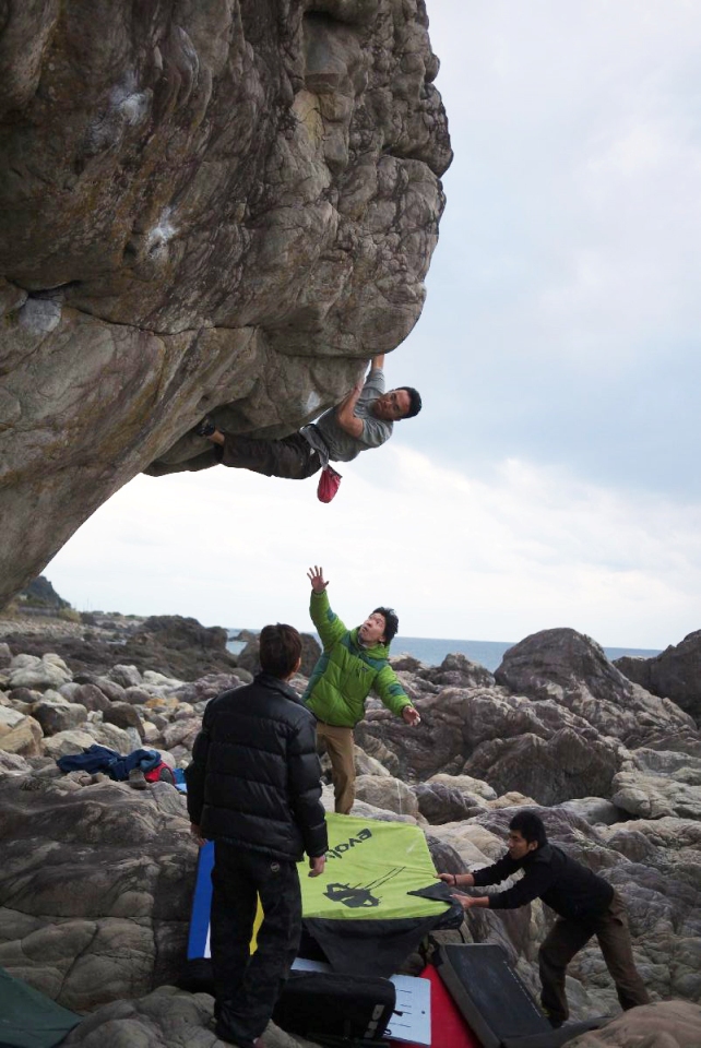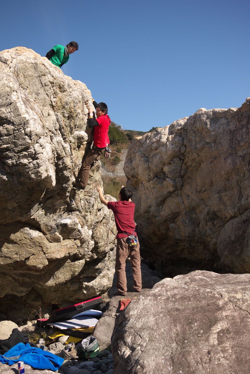 まずはロクスノにも載ってた松風という課題。浜辺に突如1つだけボルダーが出現する。到着すると同じたいちょー宅にお世話になっている豊橋組が居た。どうやらマットはいらないらしい。フォールしても砂浜だから大丈夫だそうだ。少しはまったけど何とか登れた。ロケーションも最高だね。