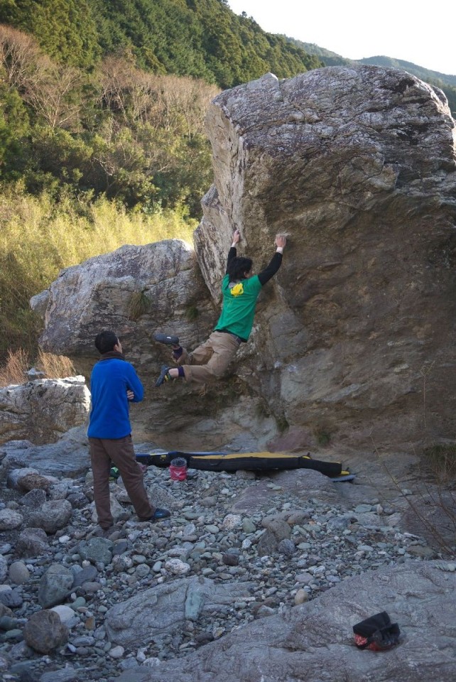 マロン家をこっそりと朝早く出発していざ岩へ!前日の夜に話し合って仁淀川のフューチャーエリアへ行くことに。マロン&くらしょーは来たことがあるらしく迷うことなく到着。さっそく登る!と思いきや寒すぎて日が岩に当たるまで待った。暖まってから超時空の左らへんを適当に登ってアップ。右らへんの雪月花っていうのもやってみたけど怖くて何度かフォール。ホールド分かったら普通に登れた!高さもあってGOODな課題だった