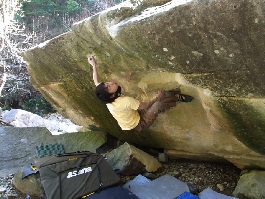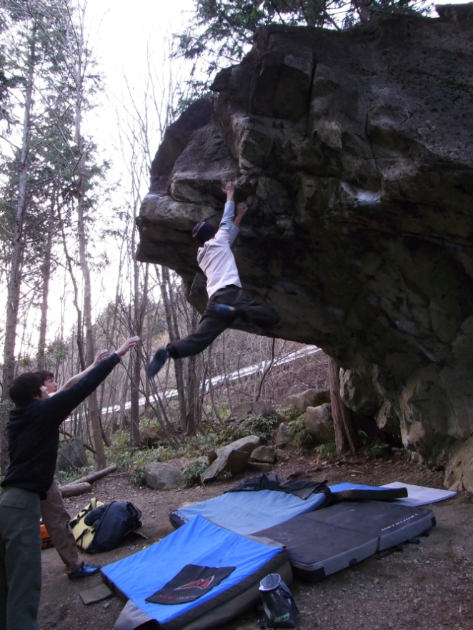 到着してからは「イコン」の偵察をしてアップかねて近くの「キナコ」っていう2段をトライしたんだけど可能性を感じなかった。八王子からきてたクライマーが隣のラインの「エルモ」っていう課題をトライしていたので浮気した。