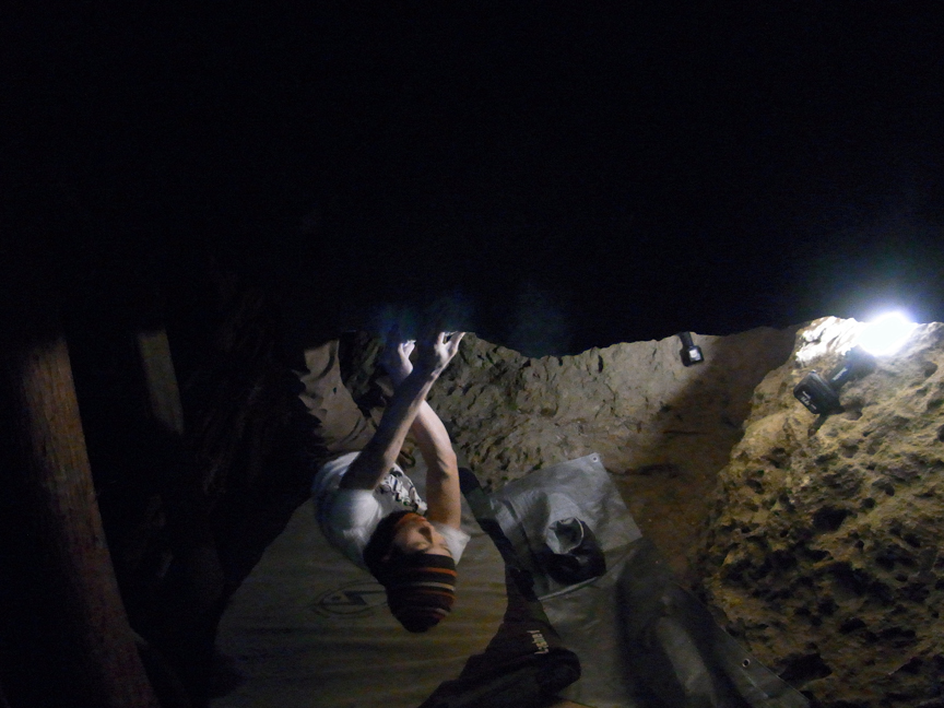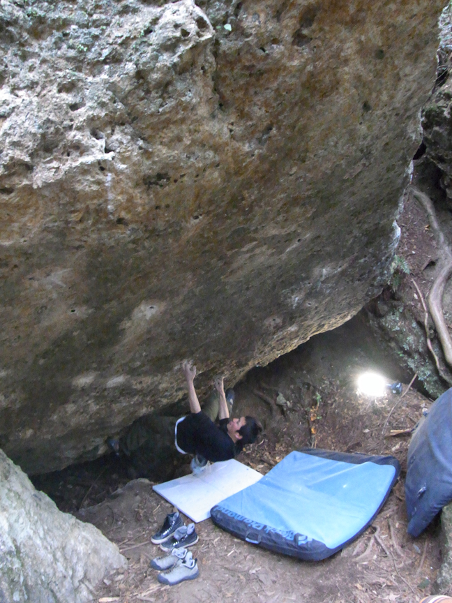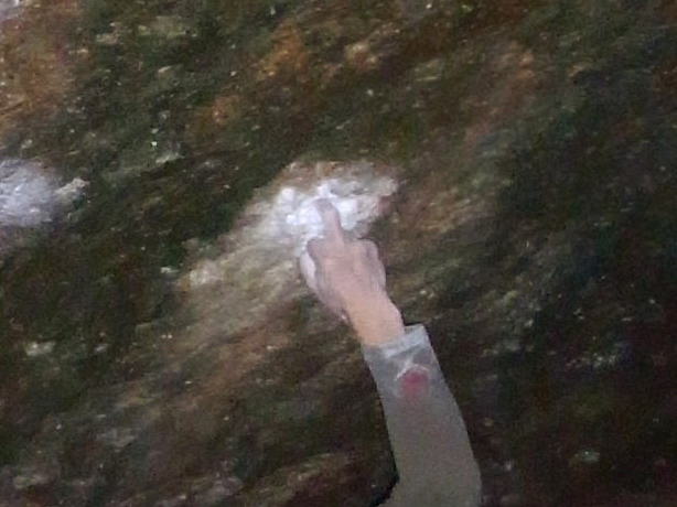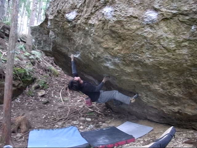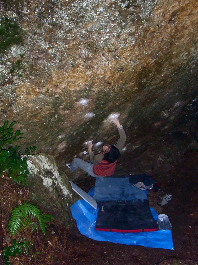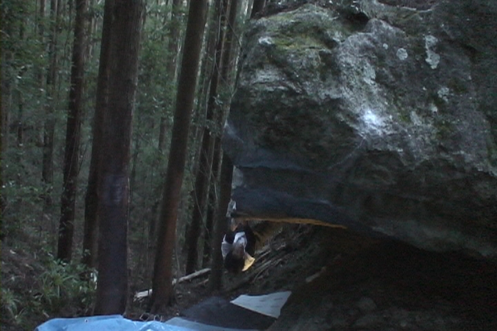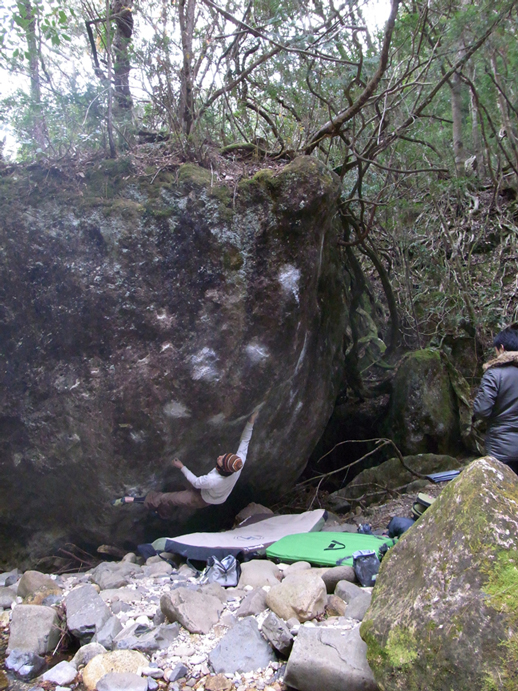 とりあえず最後ランジするときに使う左1本指をとりに行くとこの練習をしたんだけど一度も取れなかった。なんかスタンスが決まってない感じでどうもしっくりこない。磨かれまくった右手1本指はツルツル、しかも浸みだしてるのでまともにムーブが起こせない。指に悪い課題なのですっぱりあきらめて「たゆたい」をリピートしてそそくさと移動。たゆたいだったら多少濡れてても登れるんだけどなー。やっぱ4段は難しいよなぁ