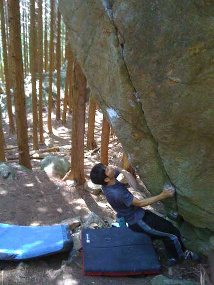 6時に浜松出発、10時くらいに到着すと思いきや9時に到着。今回は前回と違い下の駐車場から攻めてみた。結構な急登。しかも出だしで迷うことになる。岩を求めて上へ上へと登るも岩はない。結局上の駐車スペースまで歩いてしまった。せっかくなのでM伏くんにLの岩の4級課題を紹介し見学。外のボルダーはあまり経験がないと言っていたが流石SCCスタッフ。結構あっさりと登ってしまった。そそくさと違う岩へ移動。