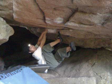 エリア移動。今度は僕の目当ての課題、モスブリッジの「ゴールデンルーフ」初段をやりに行くことに。ちと迷いましたが何とか到着。チョークで過剰なくらい真っ白になったホールド...ちとヘコミましたが気を取り直して準備。ヘッドランプを2つ持ってきたので1個はルーフ内に設置、もう1個は額に付けてトライ!